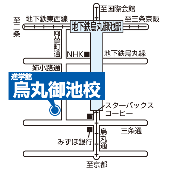 地下鉄「烏丸御池」駅の南改札を通り、4-1出口から出て一つ目の道路(両替町通)を左に曲がってください。右手に看板が見えますので階段を上がってください。2階に受付がございます。