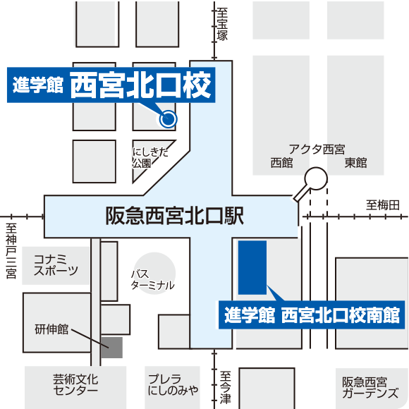 阪急「西宮北口」駅の北改札を出て、左手の階段かエスカレーターを下りると小さな広場があります。そちらを正面に右手側に校舎が見えます。1階に受付がございます。