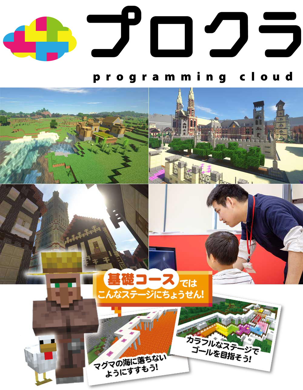進学館西宮北口校のプログラミング教室は、大人気ゲーム「マインクラフト」を使用して、遊びの延長でプログラミング的思考を学ぶ教室です。