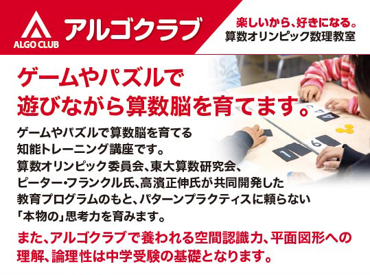 『算数オリンピック数理教室 アルゴクラブ』は、ゲームやパズルを用いて論理的思考が自然と身につく算数漬けの時間を過ごしていただく講座です。