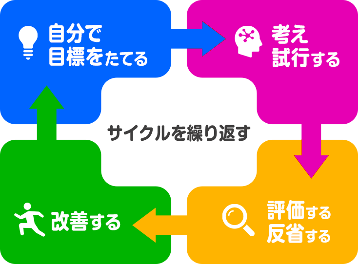 この講座の最終目標は、「プログラミングができるようになる」だけではありません。プログラミングの理論や概念はしっかりと学びますが、自ら目標を設定し、考え、試行し、反省・改善の後、再度試行するサイクルを繰り返すことで、「頭の中のイメージを具現化・視覚化するチカラ」や、「目標から逆算して物事のプロセスを考えるチカラ」を、また、自分の作品をみんなに発表することで、「人に伝えるチカラ」などが身につきます。