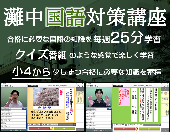 灘中 国語対策講座は、灘中合格に必要な国語の知識を、テレビのクイズ番組のような感覚で毎週楽しく学べる講座です。外来語やことわざ・慣用句などは灘中で出題される形式になるべく近づけて出題し、灘中合格に必要な知識を定着させます。