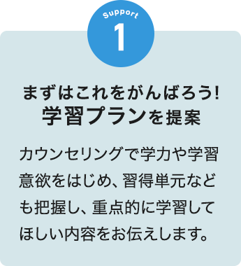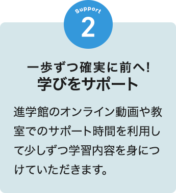 進学館オンライン動画や教室でのサポート時間を利用して少しずつ学習内容を身につけていただけます。