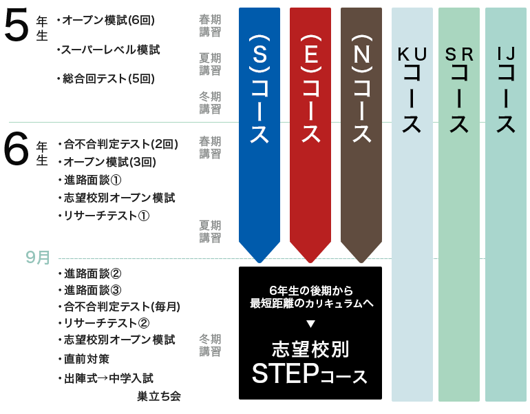 ※平常授業を志望校別のクラスに編成するのは、6年生の夏以降です。