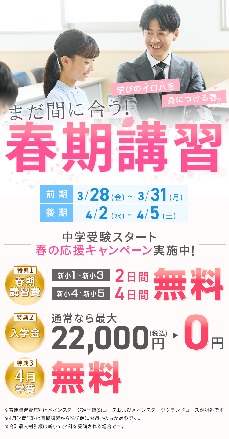 講習の体験はございませんが、新小3~新小5ではメインステージ(S)コースが最大4日間、新小1・新小2ではメインステージグランドコースが最大2日間、それぞれ無料で講習を受講いただけます。