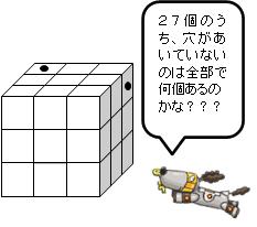 例えば、第1回の授業では右のような立方体の積み木に穴を4ヶ所あけます。どの穴も立体の反対側までくりぬいたとき、穴のあいていない小立方体は全部で何個あるかという問題を考えます。頭の中のイメージを図を使って整理しながら解く方法をお伝えします。図形の得意・不得意に関わらず、4日間楽しく賢く学んでいただけます。